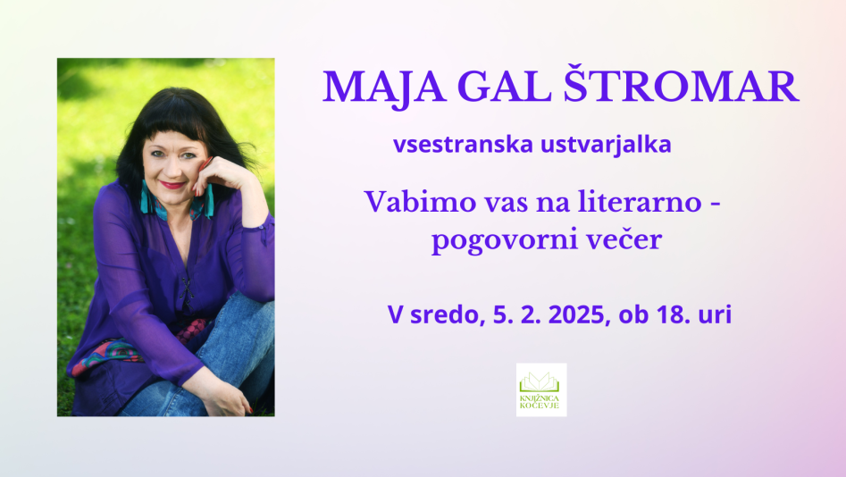 Ob bližajočem kulturnem prazniku vas Knjižnica Kočevje lepo vabi na literarno – pogovorni večer z vsestransko ustvarjalko MAJO GAL ŠTROMAR, avtorico kar 16 knjig.